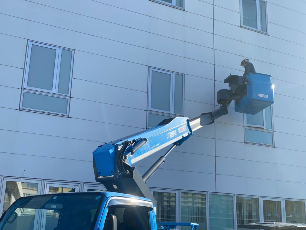 高所作業車を用いた安全かつ効率的な施工を実施。